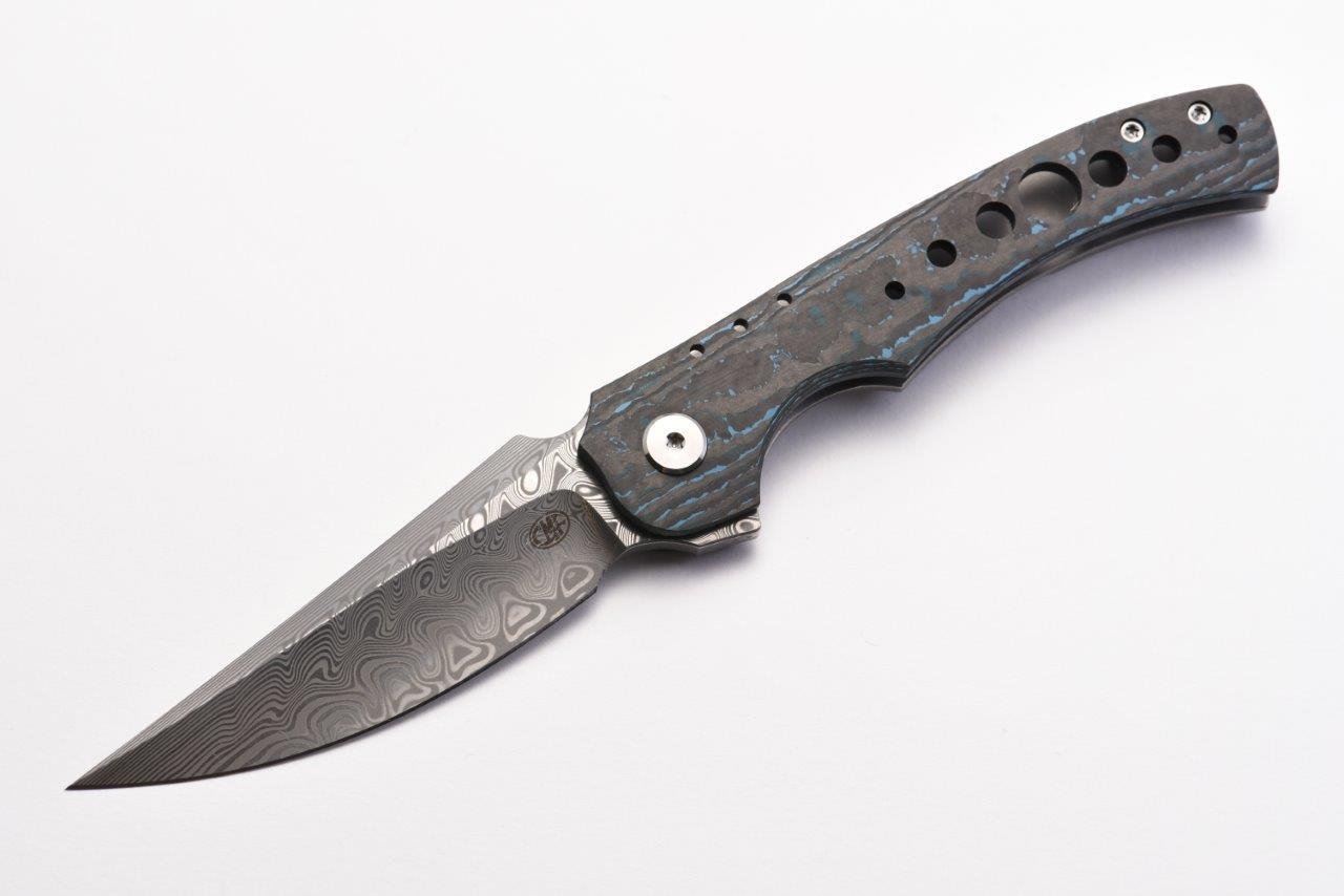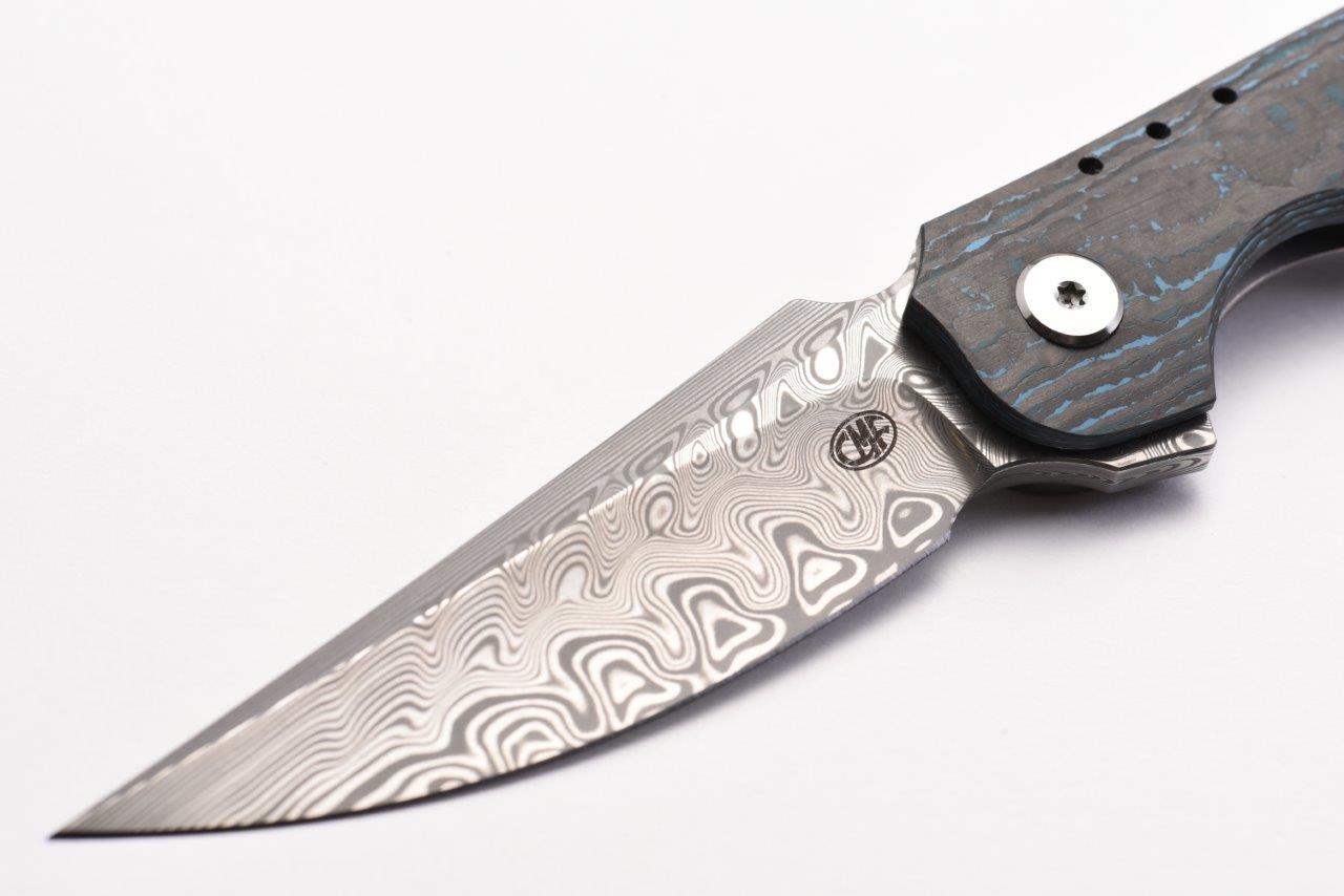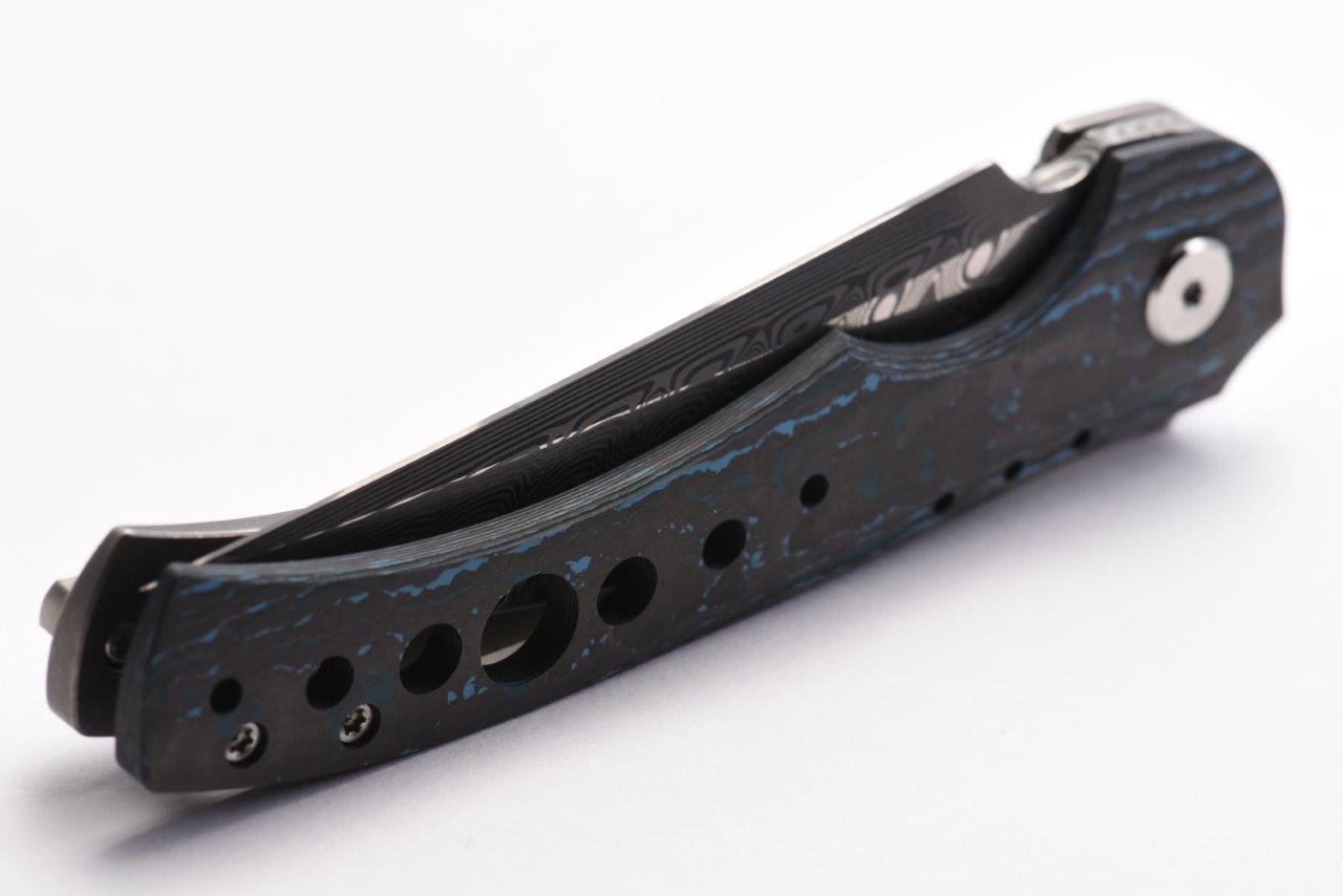 The Conquest is an Alliance Designs exclusive design by Ian Pickarski, where minimalism meets maximum performance. The Damasteel blade provides high wear and corrosion resistance providing a super sharp edge right out of the box. The modified trailing point blade shape with a hollow grind provides excellent slicing capabilities. This particular variant also features a FatCarbon show scale in ArcticStorm. A true collectors piece.